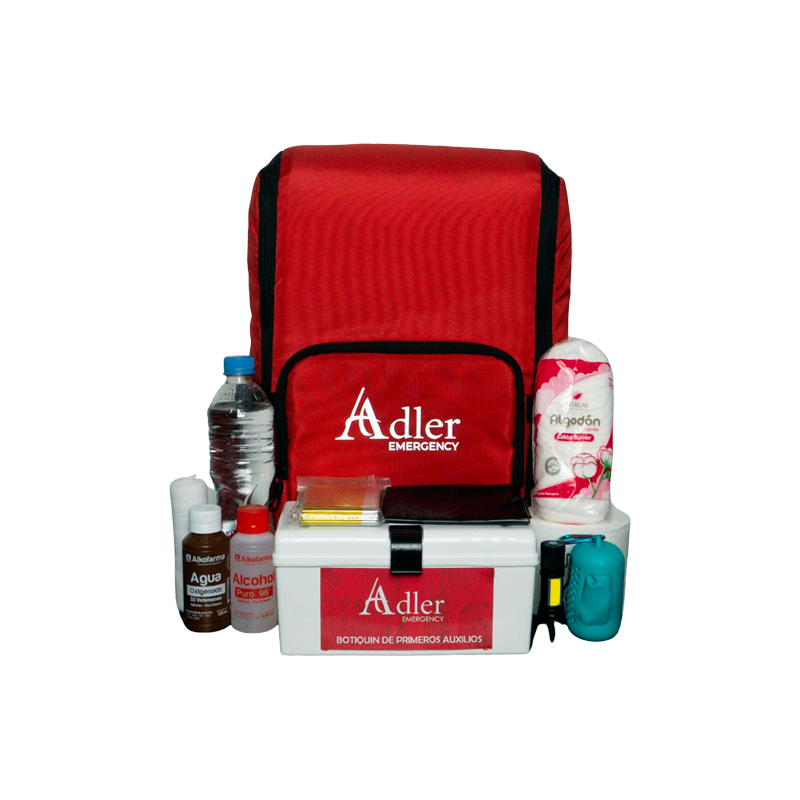 Kit mínimo: guantes, gasas, vendas elásticas, suero fisiológico, tijera punta roma.
