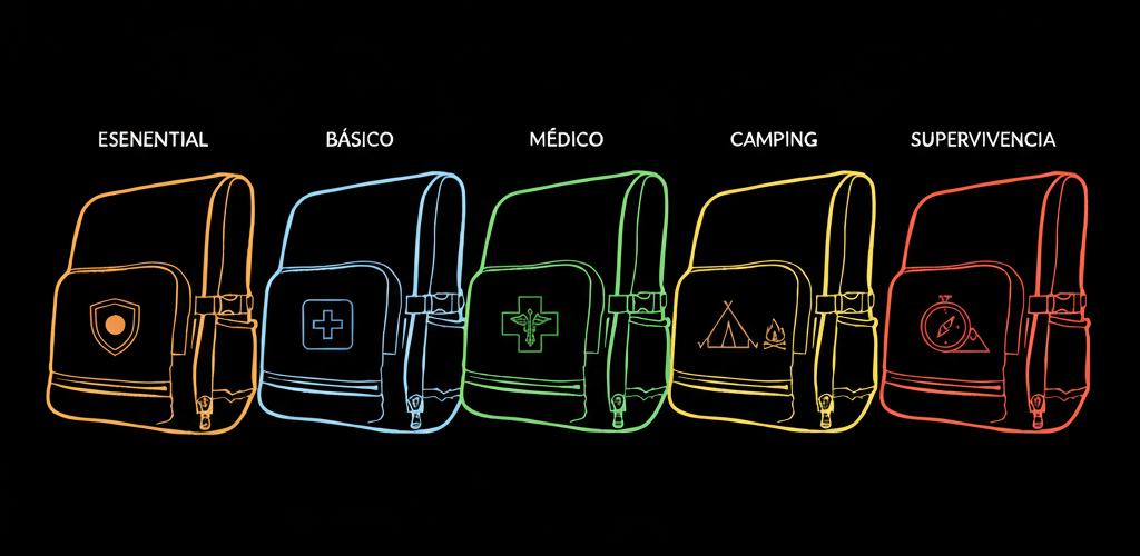 Kit mínimo: guantes, gasas, vendas elásticas, suero fisiológico, tijera punta roma.